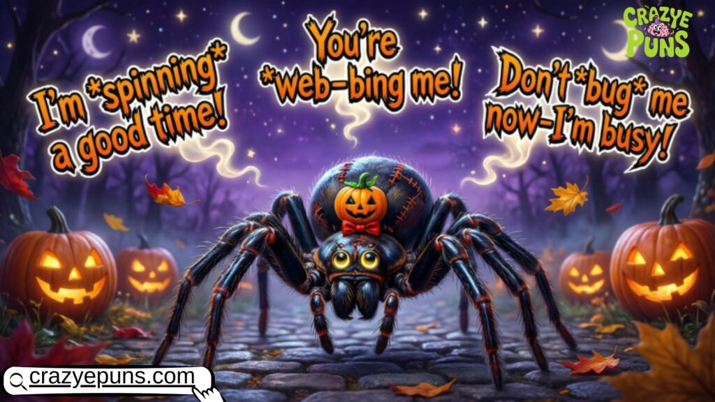 Sure! Examples include “I’m just hanging out, like a true web master” or “Spinning webs and taking names.” These puns are classic Funny Spider Sayings that make people laugh.